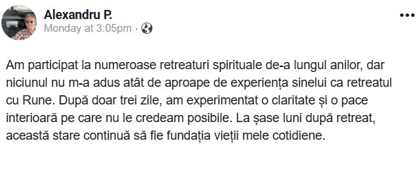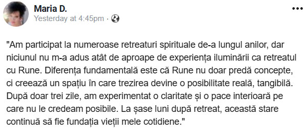 Îți mulțumesc din adâncul inimii pentru existența acestui spațiu creat de tine, unde am avut ocazia să întâlnesc acest minunat PREZENT: Rune. Mulțumesc pentru meditația trimisă prin email. Este cea mai puternică meditație pe care am făcut-o până acum. A reușit să mă plimbe prin atâtea dimensiuni, ținându-mă ancorată în același spațiu pentru a permite viziunii să fie mai înaltă. Să pot ieși din lumea emoțiilor atât de ușor și puternic în același timp. A fost fantastic. Cât de frumos te ia și te aduce ridicându-te! A avut ceva din INCEPTION. Mulțumesc. Mulțumesc. Mulțumesc!